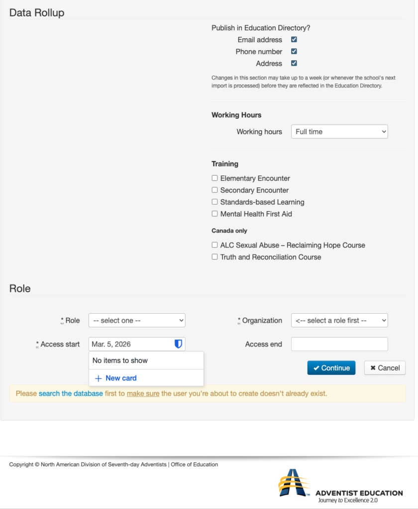 5. Choose the Role first. Then the Organization. Use the date picker to add the Start date. This is the date when you gave the access. It is NOT necessarily the date the job began.