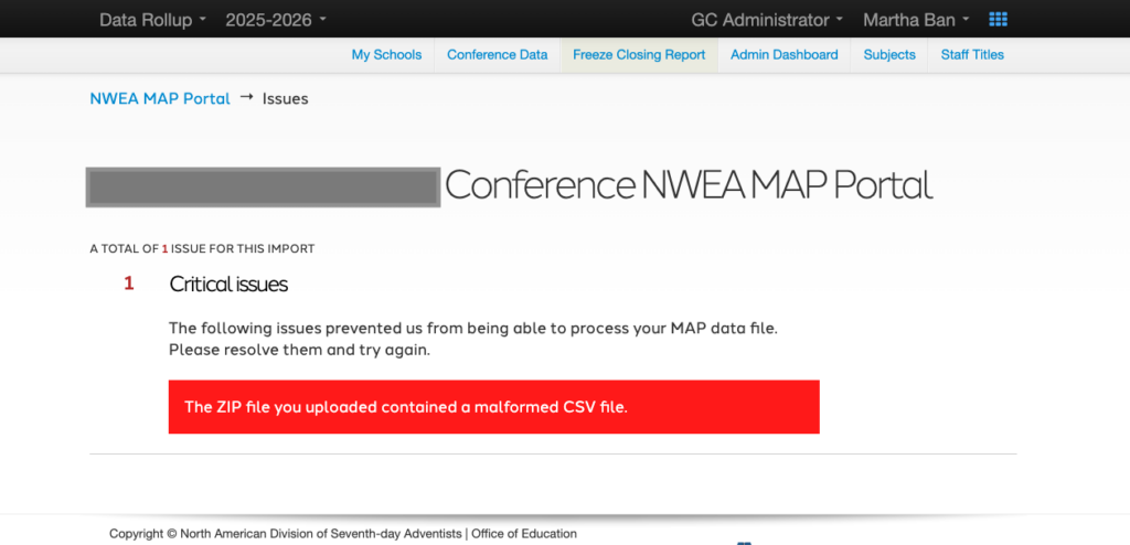 NWEA They wraps all fields in “”. When a student’s preferred name is also in quotes, it will prevent the file from uploading to the NWEA MAP portal in Data Rollup and this error will result.