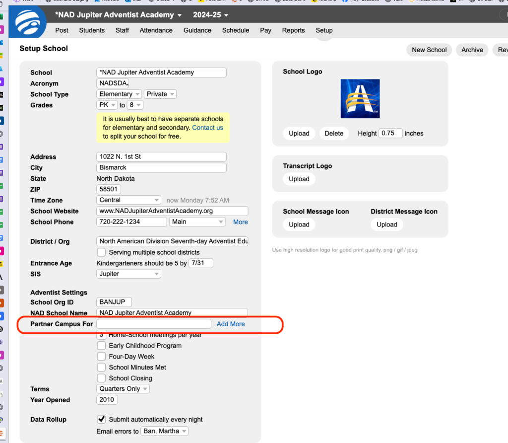 Main campuses should send a comma-separated list of organization IDs of the schools they are a main campus for. (This is in the school configuration section.)